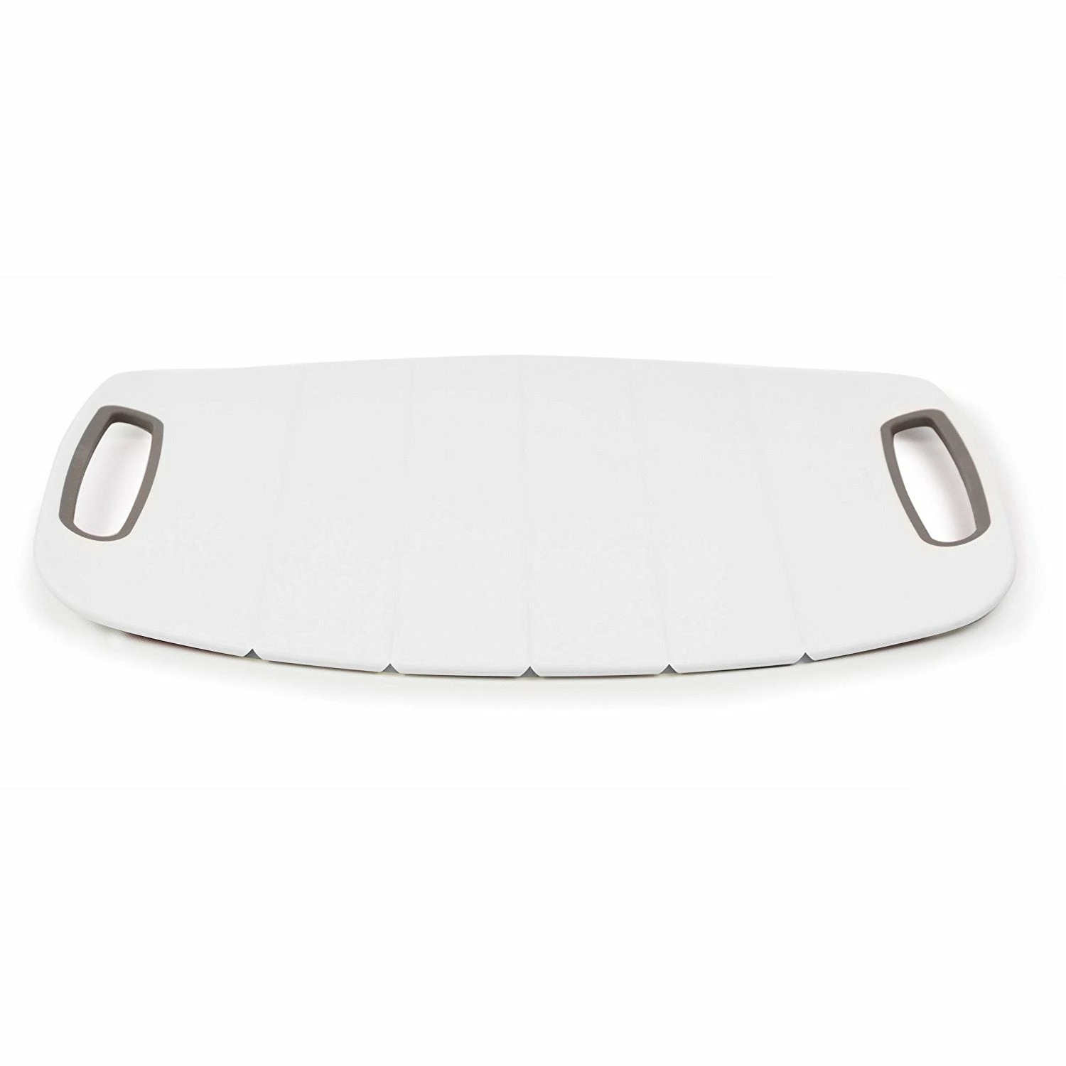 Still a heavy duty cutting board with patented gripper base, only now with flexible structure that rolls in to a cone to funnel chopped ingredients to even the smallest prep cup! Dishwasher safe. 5 year warranty. Three colors turq/green, white/warm gray & red/warm gray.