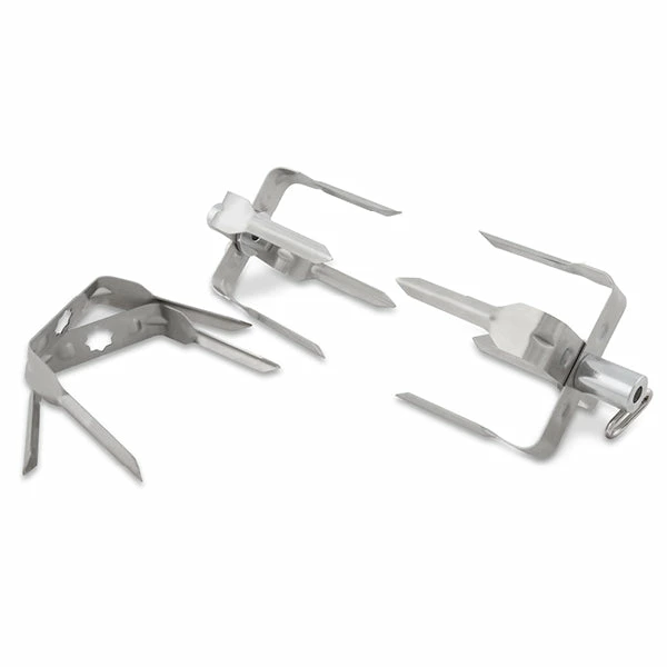 Rotisserie chickens or roasts can get unruly; cooked meats tenderize and tear easily or flop around. Don’t tie up your day tying up chickens, use the Broil King® Mega Forks! They offer more hold and can cup a roast or chicken with any combination of the 6 C shaped forks, 4 square and 2 tapered. The collar is splined to mount them in multiple positions. Fits 3/8 -IN and 1/2-IN rods.