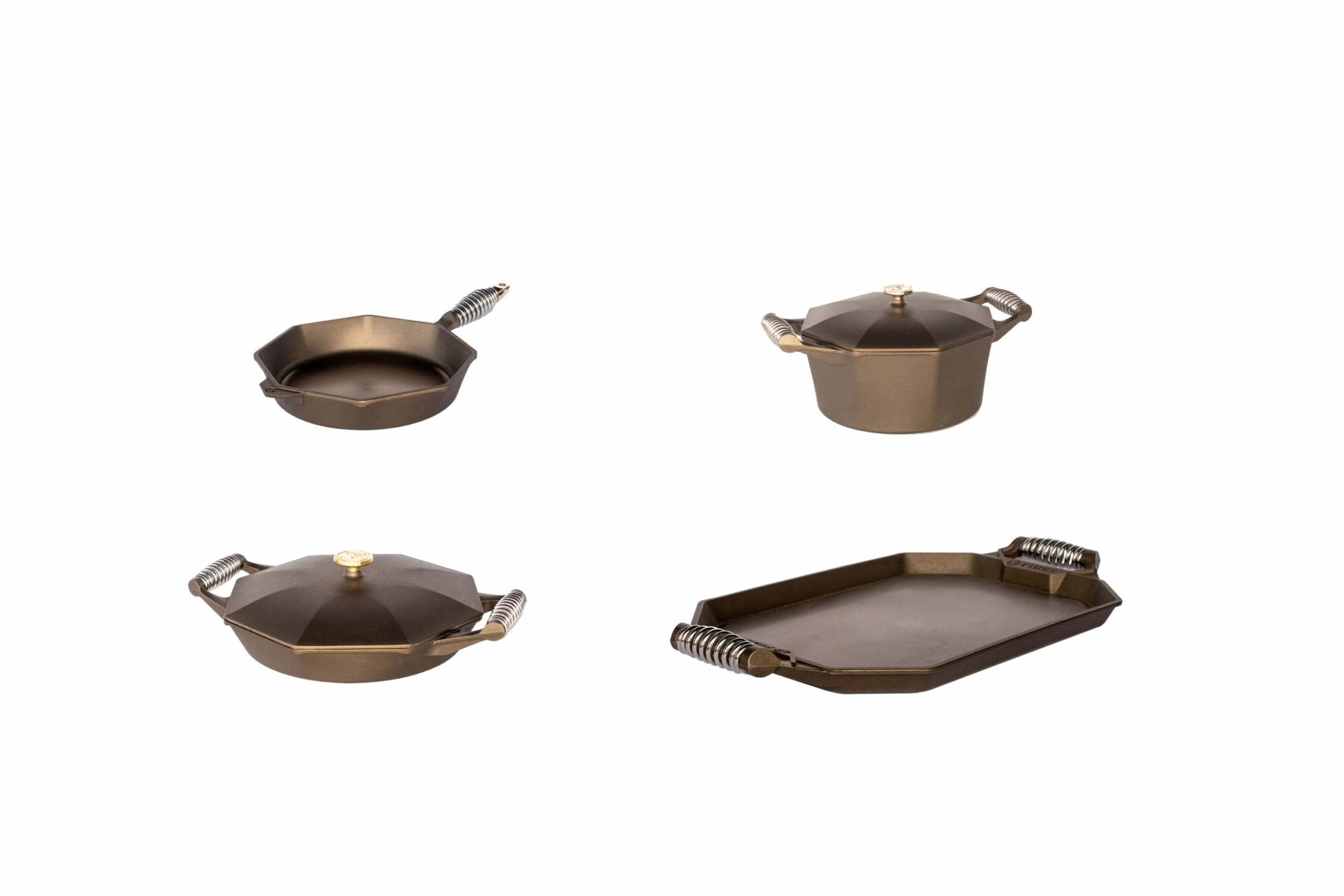 Our biggest pieces, bundled together for your best dinner parties. Dual stainless steel spring handles make our 7 Qt. Dutch Oven, Double Burner Griddle and 14″ Skillet eye catching and easy to manage. Plus, our best-selling 12″ Skillet is sure to shine on your stovetop, inspiring and enabling better everyday cooking. It shares a lid with the included 7 Qt. Dutch Oven, offering incredible versatility at an affordable price.