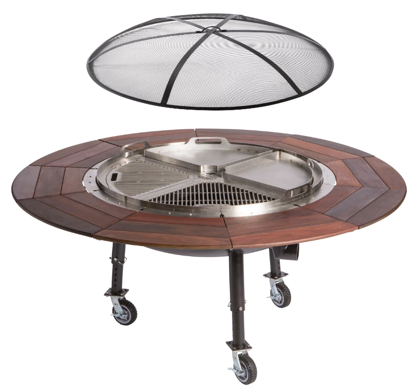 - Stainless steel ring with branded cover plates and a lazy susan sub-grate that holds a two ¼ bar grates and two ¼ griddle for a 46” diameter cooking surface