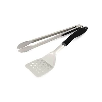 This two piece set contains an ergonomic stainless turner with black handle and grey accents and a stainless locking tong with soft grip handles.