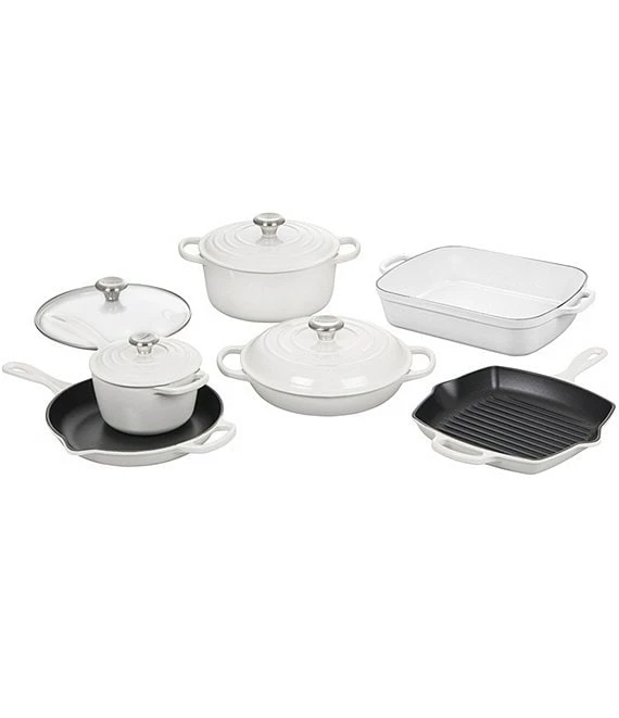 Set includes: 4 1/2 qt. round Dutch oven, 5 1/4 qt. signature roaster, 2 1/4 qt. braiser, 1 3/4 qt. signature saucepan, 10 1/4″ signature skillet, square skillet grill, 10 inch glass lid with stainless steel knob