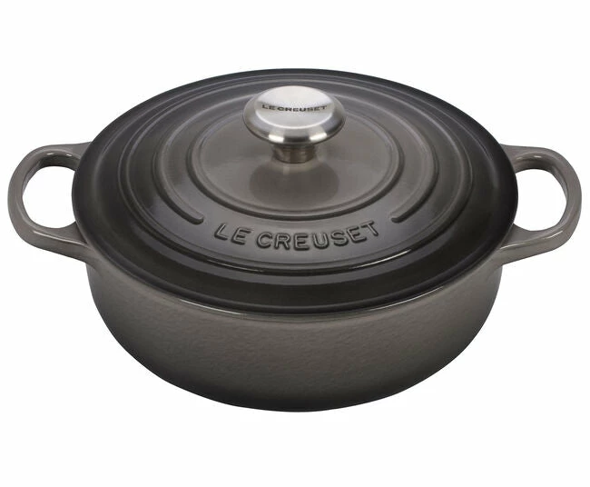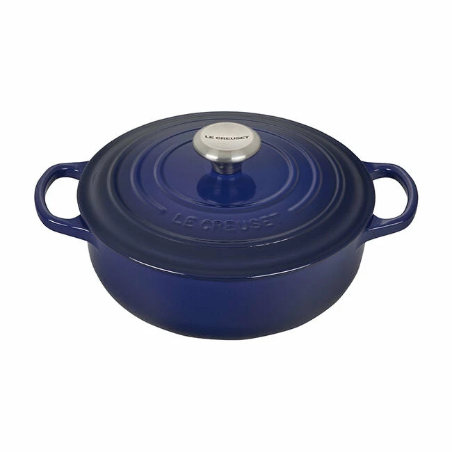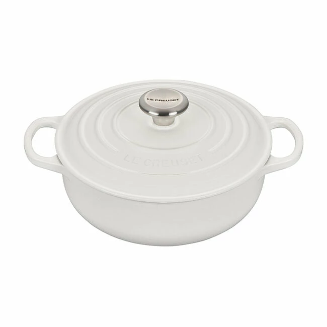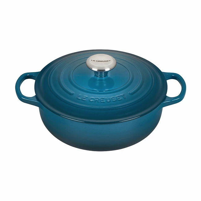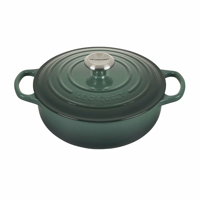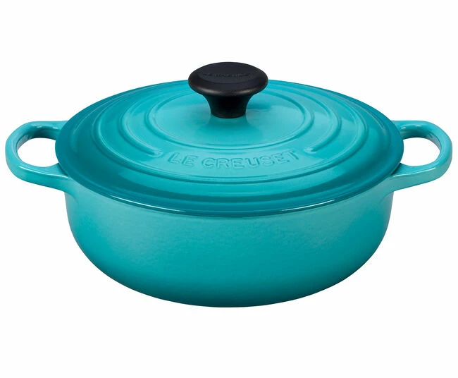 Its cast iron construction enhances the cooking process by evenly distributing heat and locking in the optimal amount of moisture. The interior enamel resists chipping and cleans evenly, and ergonomic handles provide a secure grip, even while wearing oven mitts.