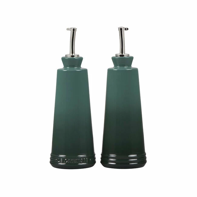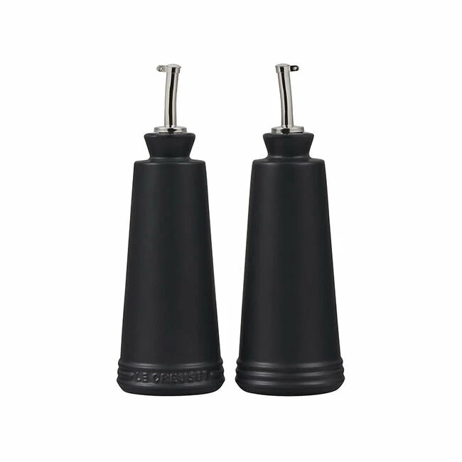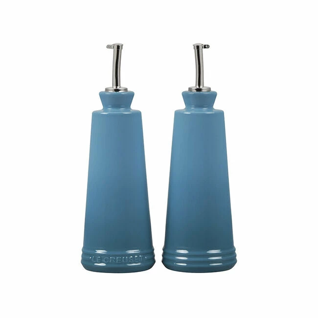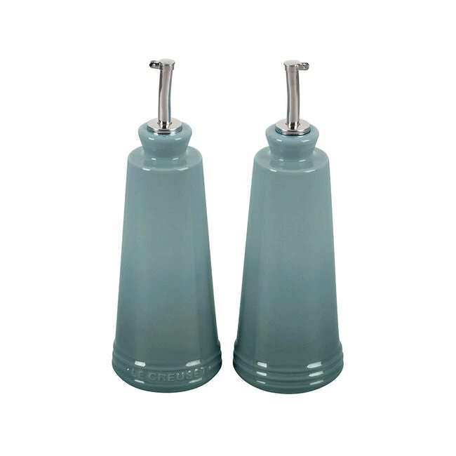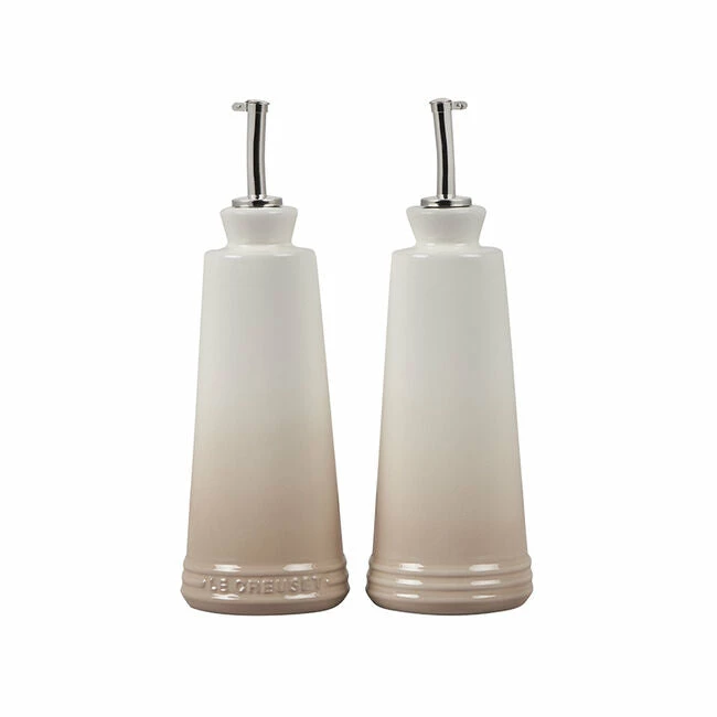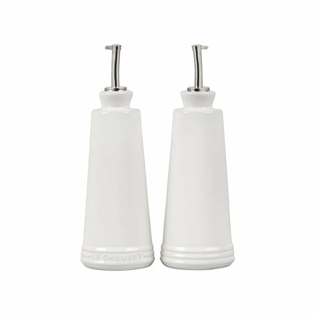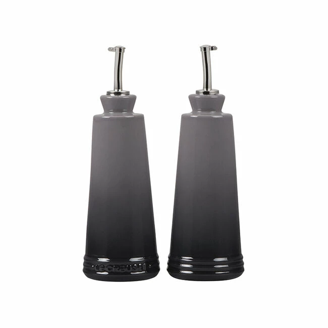 Whether prepping in the kitchen or serving at the table, the Oil and Vinegar cruets are designed to hold and serve all varieties of oils, vinegars and other liquids. Crafted from our finest quality stoneware to protect oils from the damaging effects of light and heat, the contemporary design features a stainless steel nozzle for precise control when pouring. They’re finished with an impermeable glaze inside and out that is easy to clean and dishwasher-safe, while the addition of the Le Creuset name on one of the bottles makes it easy to distinguish between the set of two.