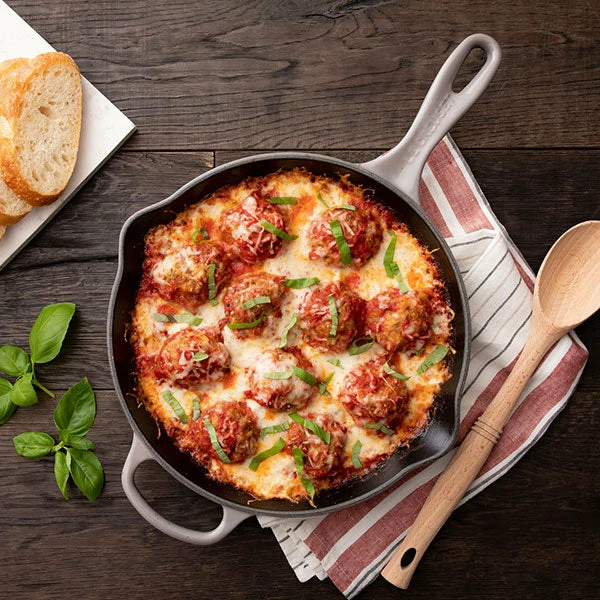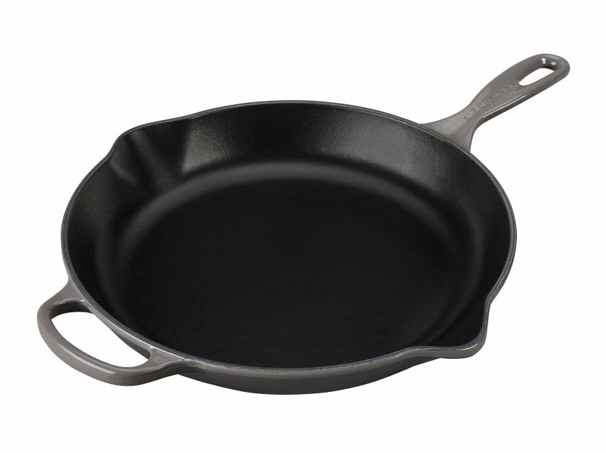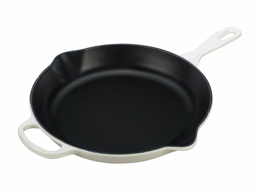 Cast iron skillets are indispensable in the kitchens of home cooks and professional chefs alike. The interior surface of a Le Creuset skillet is finished with a matte black enamel that eliminates the need for the traditional seasoning and maintenance of raw cast iron. Specially formulated for high-surface temperature cooking, the enamel develops a natural patina over time that is ideal for searing, sauteing and frying.