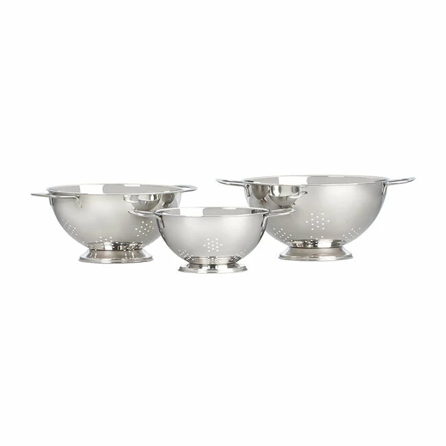 Stainless Steel Colanders are an indispensable tool in the kitchen for rinsing fruit and vegetables, draining pastas and canned foods, straining yogurt and cheese, and more. The pedestal base provides excellent stability, while the flat wire handles ensure a firm grip with wet hands. Designed to nest inside each other for easy storage, durable stainless steel is easy to clean and doesn’t absorb odors or flavors.