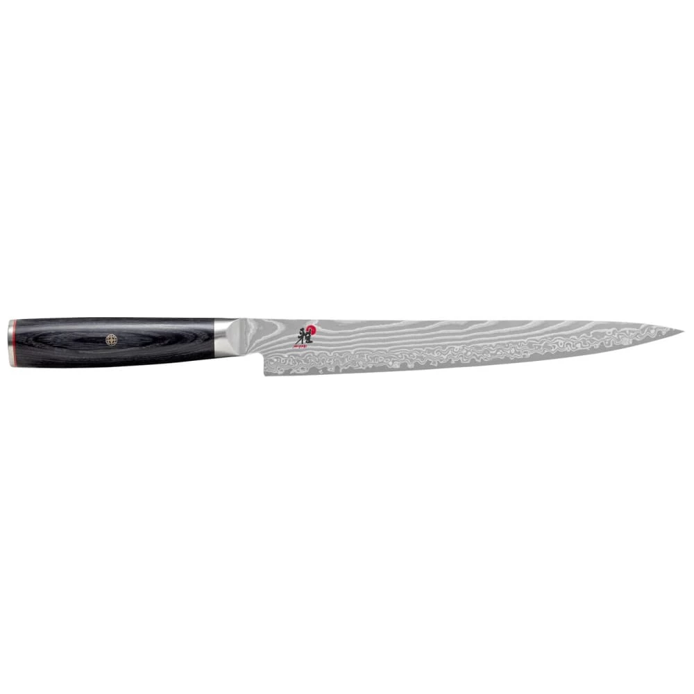 Kaizen II Slicing/Carving Knife, 9.5″, forged fine carbide super steel blade with 48-layer Damascus pattern, D-shaped black pakkawood handle, mosaic pin, end cap with logo, made in Japan