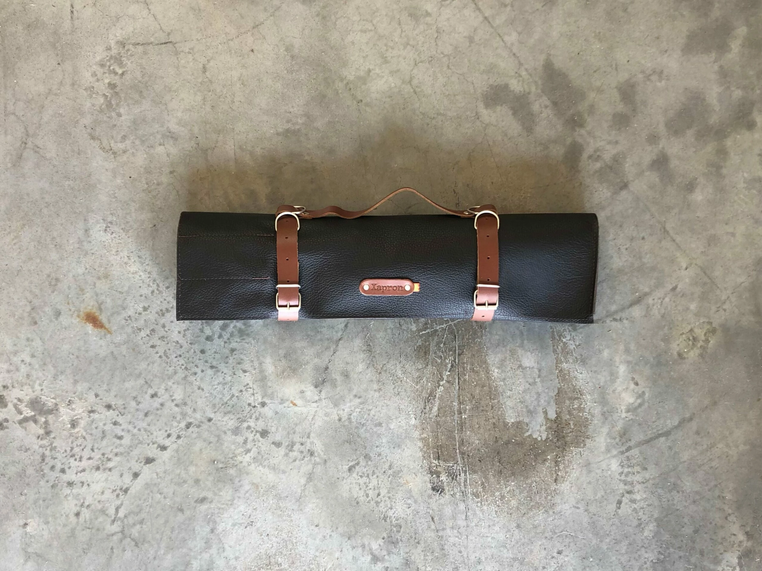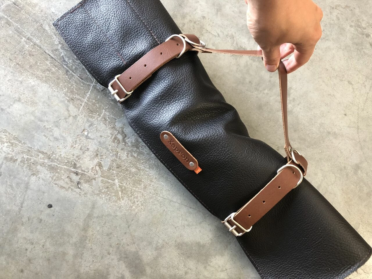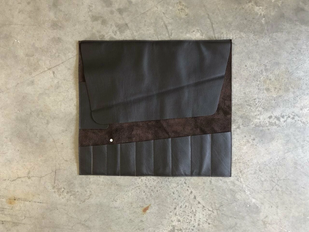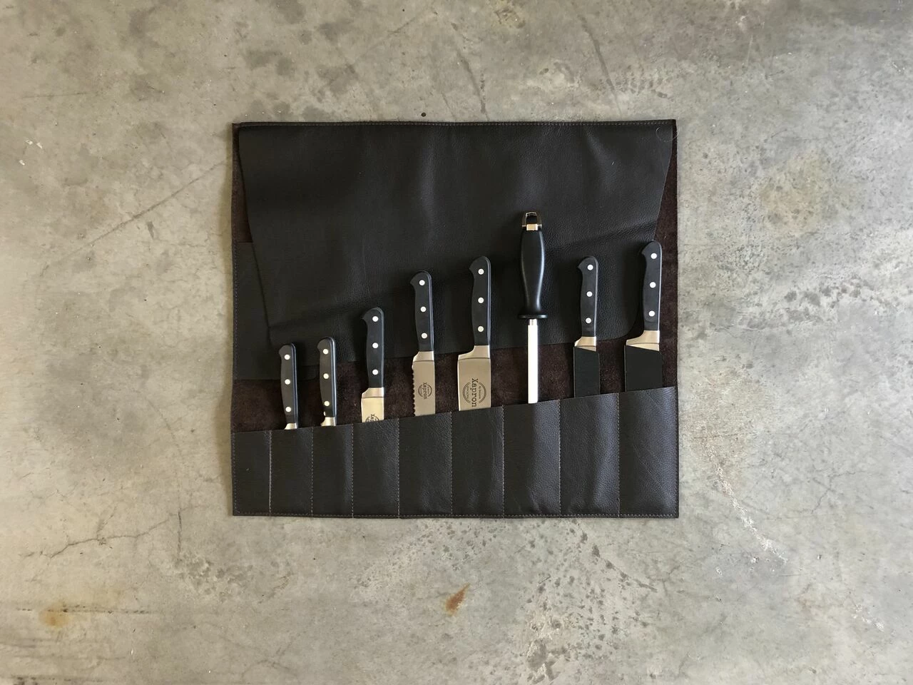 Extra long. Extra place to store your long knives. Space for at least 9 knives with a total length of almost 20″ fit in this leather kniferoll with case (fits most 12-14″ knives). In addition, the XL variant has a strong leather handle + and it can be expanded with a sturdy shoulder strap. This makes it even easier to take along on the road. For the time being this variant is only available in a Montana leather and in the color Brown.