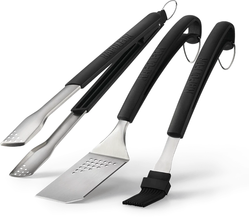 Napoleon’s 3 Piece Toolset is made from cast stainless steel with comfortable soft-touch handles for a non-slip grip. The extra-long spatula is perfect for steaks and other large food with its bladed tip and serrated edge. The easy-lock stainless steel tongs are always ready for action, their comfortable grip making it easy to hold and move your grilled delicacies. Don’t forget to splash on the sauce with the silicone basting brush. Be the boss of your grill with this 3 Piece Toolset.