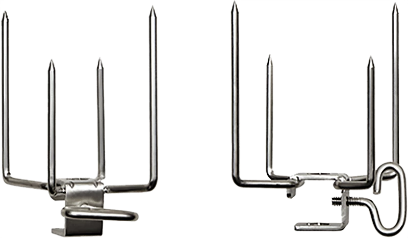 You can grill more than one piece of meat on the rotisserie at once with the Napoleon Commercial Quality Rotisserie Forks. They come with two 4-pronged forks that slide easily to hold your meat in place and thumb screws to hold the forks on the spit. These Rotisserie Forks are made entirely of stainless steel, cleaning easily after use. Replacement forks for and rotisserie with 12mm hex rod or 8mm square rods.