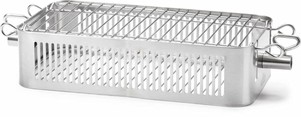 Securely hold your favorite foods like ribs, lamb racks, and large vegetables with the Napoleon adjustable stainless steel rotisserie basket. Secure food in this four-level adjustable rack so that it is held in place for perfect, all-around cooking. Rotisserie cook foods that you never thought you could in this food-grade stainless steel cage. This rotisserie accessory is designed to fit both hex and square spit rods to ensure that it can be used on all barbecues. This accessory is easy to clean, both by hand and in the dishwasher. Clever, multifunctional, and easy to maintain, every kitchen benefits from the addition of a Napoleon barbecue accessory.