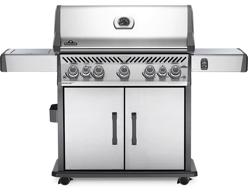 The Napoleon Rogue® SE 625 Stainless Steel Propane Gas Grill with Infrared Side Burner and Rear Burner is a durable stainless steel grill. Featuring five main burners, a rear rotisserie burner, and a high top lid, this grill has everything you need to create gourmet meals. Sear restaurant-style steaks on the integrated sear station, while generous side shelves provide plenty of prep space.