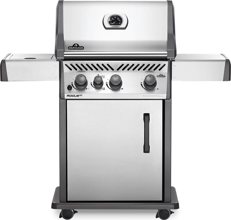 Napoleon’s Rogue® XT 425 Stainless Steel Natural Gas Grill with Infrared Side Burner has three burners, cast iron grids and a high top lid. This grill lights easily, every time, with a battery-free ignition. Grill the perfect steak using the integrated sizzle zone side burner or use it to make sauces and sides while grilling, and searing on the main area. The durable materials are both stylish and easy to maintain.