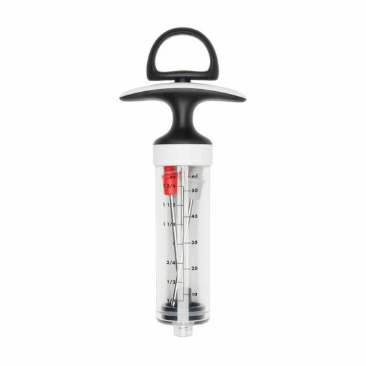 Whether you like to season with brines or butter, marinades or minced garlic, inject more flavor in less time (and more fun!) with the OXO good grips flavor injector. Simply fill the BPA-free Tritan body with the marinate or sauce of your choice, using the convenient measurement markings if your recipe calls for it, and inject your roast or bird with delicious flavor. The large, open handle provides a comfortable grip while pushing and pulling at any angle. Two color-coded tips are included: a wide needle for thick marinades and sauces, and narrow for thin marinades and melted butter. The needles feature grips to twist on and off, even with slippery fingers, and all parts dissemble for easy, thorough cleaning.