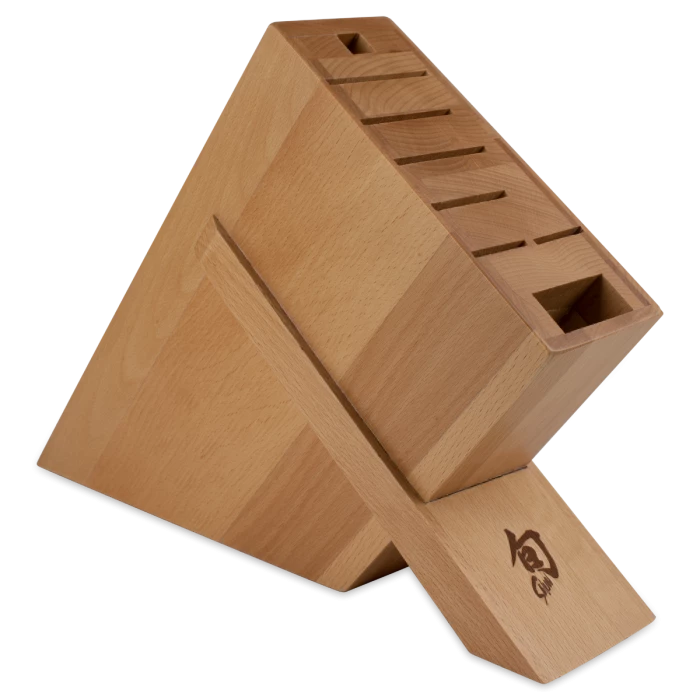 This slim knife block helps preserve more of your counter space. It is made of beautiful, blond beech wood known for its straight grain and fine-to-medium texture. This angled block accommodates up to 8 pieces of your most-needed kitchen cutlery—including your kitchen shears and honing steel. The block’s kickstand is enhanced by the elegant Shun logo.