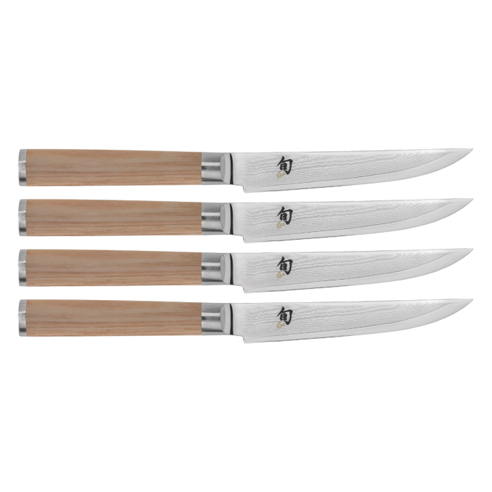 Enjoy a perfect steak dinner with friends and with the Shun Classic Blonde 4-piece Steak Knife Set. The razor-sharp fine edge cuts cleanly through each steak, keeping more of the juices—and more of the flavor—inside the steak. This set of four beautiful steak knives are a perfect length; long enough to handle even the largest steak yet compact enough to provide excellent cutting control. This four-piece set is ideal for a small dinner party. The Shun Classic Blonde Steak Knife Set comes in an elegant box, perfect for gift giving or storage.
