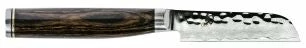 The Shun Premier Vegetable Knife is part of the beautiful Shun Premier line, which calls to mind the hand-forged knives of ancient Japan. While each knife still takes at least 100 handcrafted steps to complete, the materials Shun uses are among the most advanced in the industry. Each blade has a cutting core of Shun’s proprietary VG-MAX “super steel” to take and hold a precision edge. The layered Damascus cladding supports the core and provides additional stain resistance. Near the edge of the blade, where the steels meet, an undulating line is formed—similar to the hamon formed when samurai swords are tempered using a traditional clay-baking technique. The hammered tsuchime finish acts like a series of hollow-ground cavities to reduce drag. The handles nestle comfortably in the hand, while the embossed end cap adds balance and beauty.