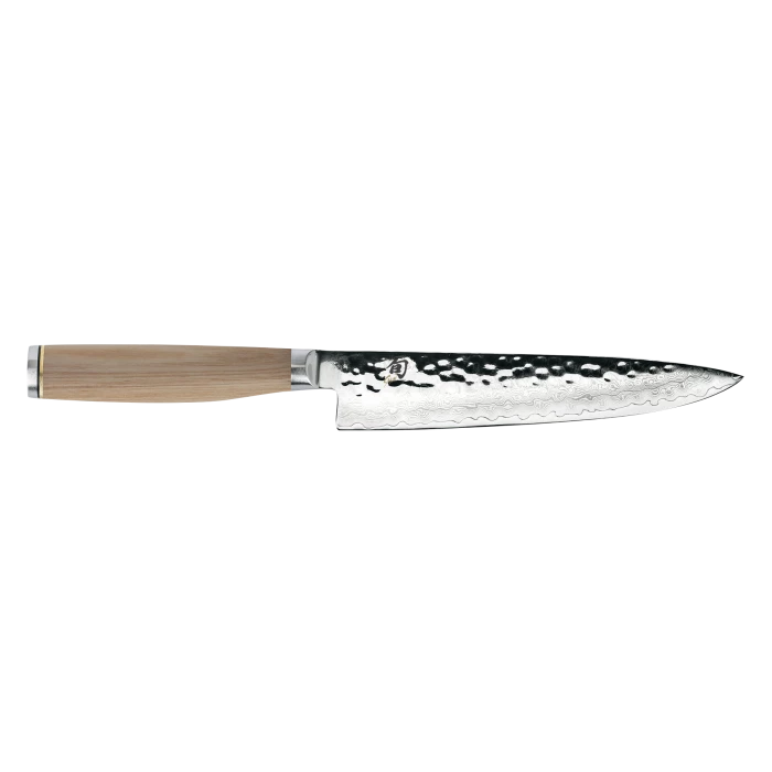 A good utility knife is the third member of your essential kitchen knife line up. In size, a utility is between a chef’s knife and a paring knife, making it the perfect size for all those in-between tasks. For trimming green beans, broccoli, and other jobs where you need some precision, your utility knife is an excellent choice. Any time a paring knife seems like too little and a chef’s knife too much, reach for a utility knife. The Shun Premier Blonde Utility Knife offers a razor-sharp 6-in. edge that also makes quick work of anything that goes in a sandwich—meats, cheeses, tomato slices, and more. That specialized use is why this style of knife is also sometimes called a sandwich knife.