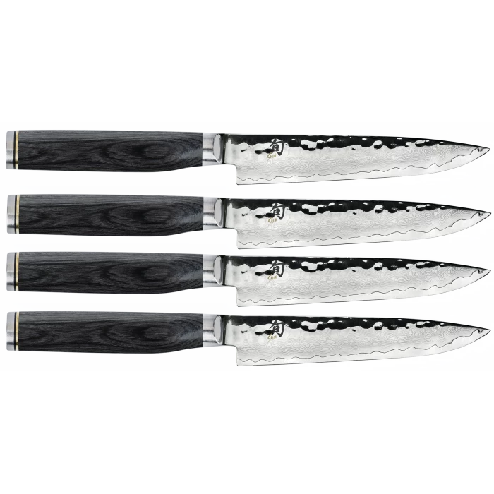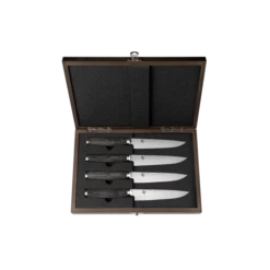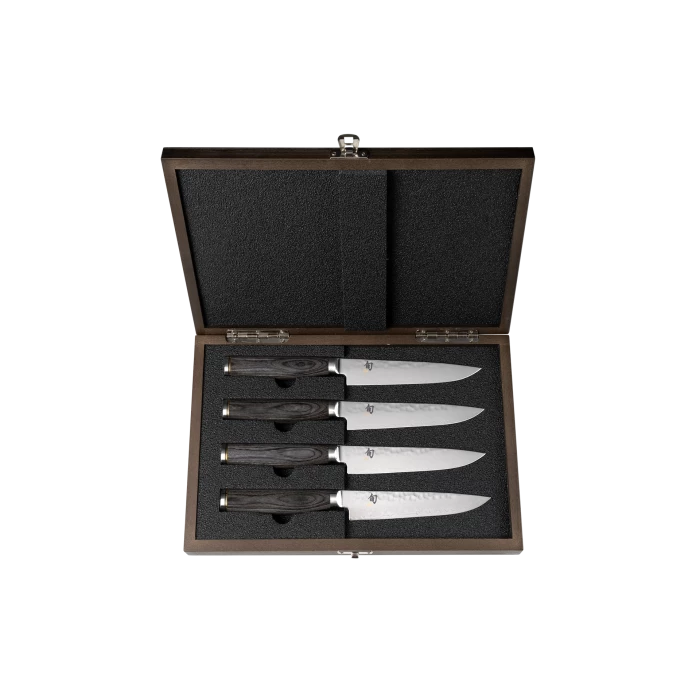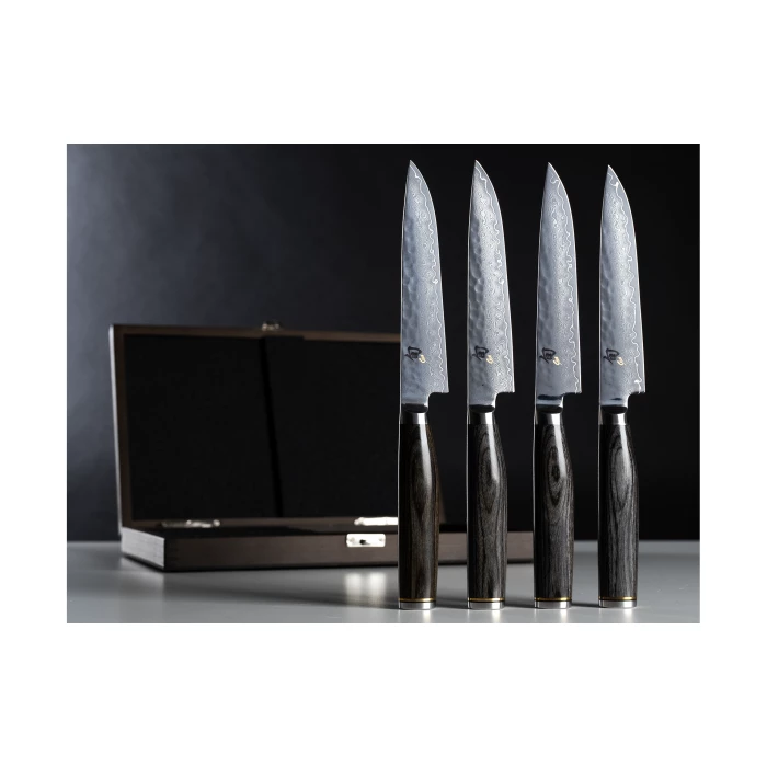 A good steak deserves the right steak knife. Because the right steak knife can make steak taste even better—by helping keep more of the flavorful juices inside the steak. A razor-sharp knife, like the Shun Premier Grey Steak Knife, will glide through the meat, cutting fewer of the capillaries in the steak and keeping more of the flavor inside. This set of beautiful Shun Premier Grey Steak Knives includes four knives in the perfect five-inch length. They’re long enough to handle even the largest steak, yet short enough to provide excellent cutting control. Ideal for a small dinner party, the Shun Premier Grey Steak Knife Set comes in a beautiful wood box, perfect for either gift giving or storage.