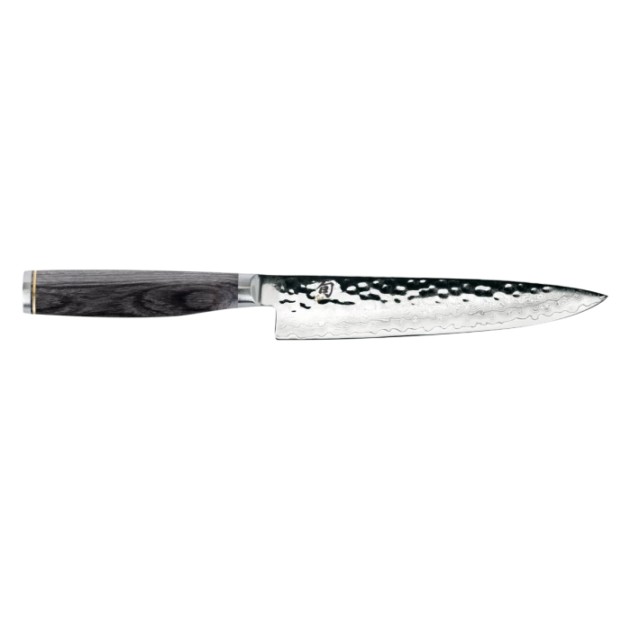 A utility knife is the third member of your must-have triad of kitchen knives. With its 6.5-inch blade, the Shun Premier Grey Utility Knife is between a chef’s knife and a paring knife in size. It is ideal for all those in-between-sized tasks, from trimming vegetables to slicing sausages. For any job that takes precision, the utility knife is a top choice. Sophisticated, grey Pakkawood handles and a razor-sharp edge enables you to make quick work of a wide range of cooking tasks—using a gorgeous knife that you will enjoy using every time.