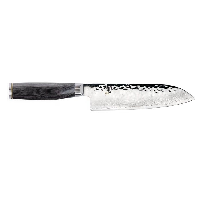 The Shun Premier Grey 7-in. Santoku is a beautiful, Asian-inspired chef’s knife. This knife has many talents and easily handles all the basic kitchen cutting tasks. This beautiful santoku features Premier’s razor-sharp blade with hammered finish and our sophisticated, new grey Pakkawood handle. Slightly shorter than the standard chef’s knife, the santoku is light, agile, and very easy to maneuver. We added just enough belly curve to enable quick, rocking cuts, too. As easy to use as a chef’s knife, this beautiful santoku will be your new go-to knife.