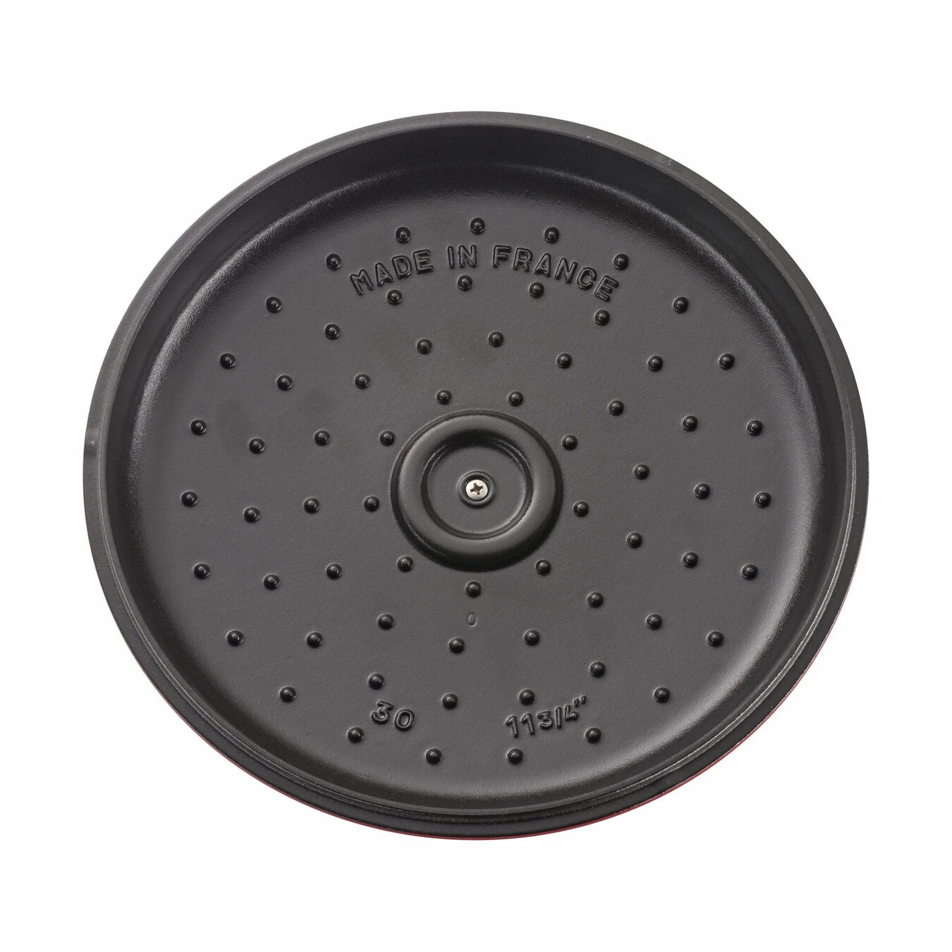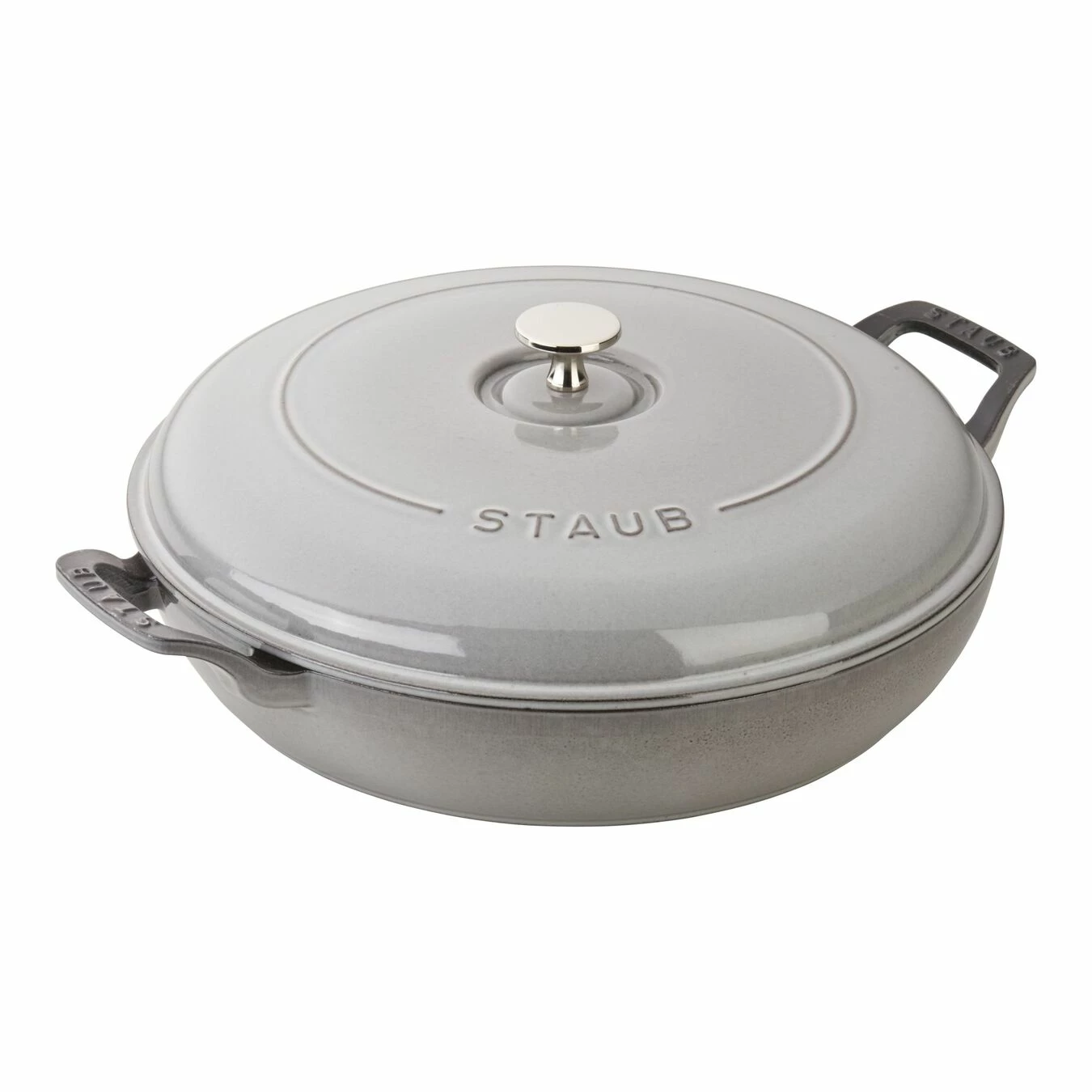 The Staub Cast Iron 3.5-qt Braiser is the perfect pot for one-dish suppers, braised lamb shanks, and breakfast hash. It will quickly become your go-to cooking vessel, perfect for sauteing, frying, braising, and roasting. Thanks to its vivid Majolica enameling – a three-step technique that imbues the color with brilliance and depth – this iconic piece beautifully transitions from oven to table.The domed lid makes it easy to cook large cuts of meat – its heavy weight helps lock in moisture for flavor-enhanced food. The braiser’s unique design features vintage look handles that encourage easy maneuvering while wearing oven mitts.