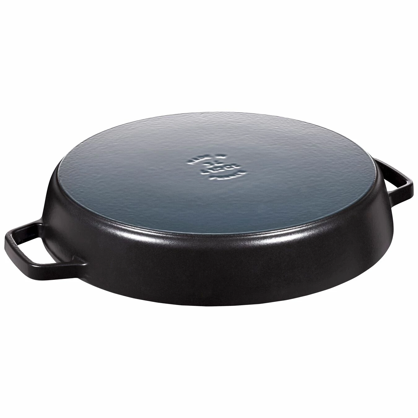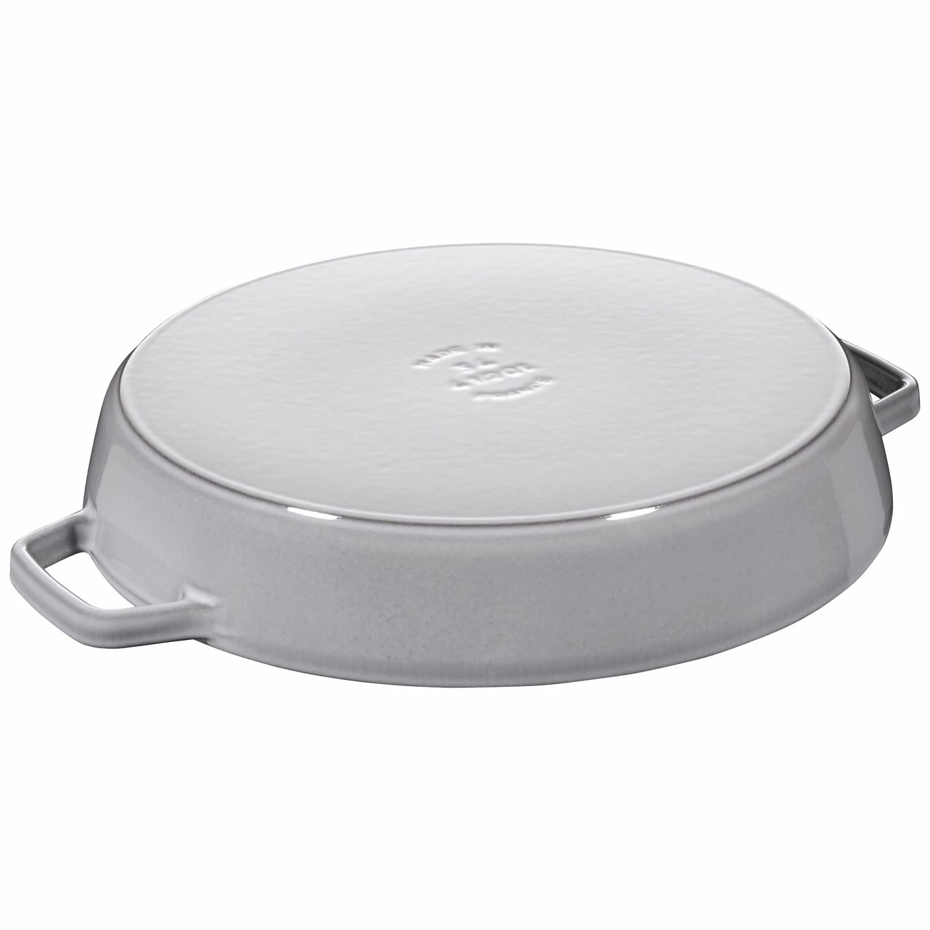 The Staub fry pan browns foods beautifully, be it chicken breasts, potatoes, or bacon. The enameled black matte interior imparts texture, promoting exceptional browning. Cast iron offers steady, even heat distribution, so the temperature of the pan won’t drop as you cook. Low, curved sides make it easy to flip the food, which releases easily.Staub enameled cast iron cookware is the choice of the world’s best chefs. With exceptional durability, it is perfect for day-to-day use in both gourmet home kitchens and prestigious restaurants around the world. Each piece transitions beautifully from the kitchen to the table. Built to last a lifetime, these heirloom pieces can be passed from generation to generation.