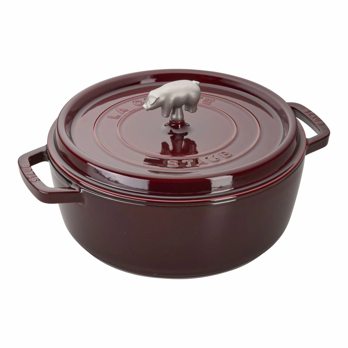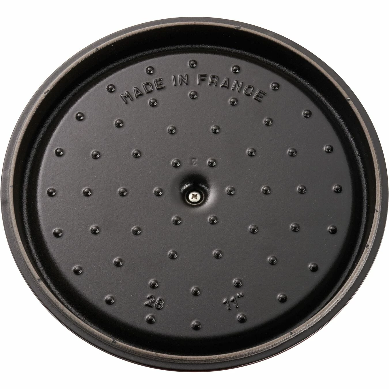 The Staub cocotte is unsurpassed for slow-cooking meats and vegetables to tender perfection, and for simmering hearty stews and soups. Cast iron possesses exceptional heat-retaining qualities, so the pot heats evenly throughout. The innovative lid features tiny spikes on the interior that continually release condensed liquid back onto the food, yielding moist, flavorful results.Staub’s special matte black enamel interior and self-basting spiked lid guarantee perfect browning and braising for flavor-enhanced food. With their exquisite enamel finish, each piece transitions beautifully from the kitchen to the table. From comfort food to sumptuous suppers, every dish is special when served in Staub.Staub enameled cast iron cookware is the choice of the world’s best chefs. With exceptional durability, it is perfect for day-to-day use in both gourmet home kitchens and prestigious restaurants around the world. Built to last a lifetime, these heirloom pieces can be passed from generation to generation.