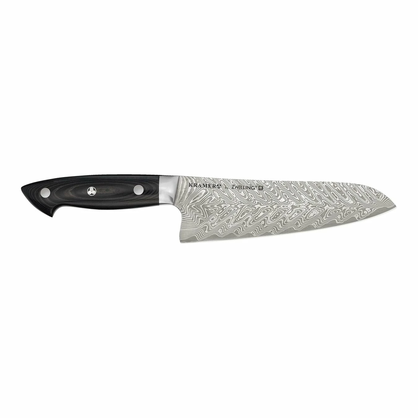 Created with Master Bladesmith Bob Kramer, the KRAMER by ZWILLING EUROLINE Stainless Steel Damascus Collection features stainless steel blades made to his exacting standards, maximizing curves, balance and utility. Bob’s design has an extremely wide blade to maximize knuckle clearance for larger hands and for cutting through large produce and piles of food. Chopped food can easily be transported with this impressive, broad blade.The knives are hand-finished with a traditional 3-step process by skilled Japanese artisans. Combined with the SG2 micro-carbide powder steel, the ice-hardened CRYODUR blades deliver scalpel-like sharpness, stay sharper longer and can withstand more sharpening over their lifespan. The SG2 super steel core is protected by an exceptionally beautiful 100-layer Chevron Damascus pattern, which is complimented by a stunning black linen Micarta handle and signature Bob Kramer mosaic pin.