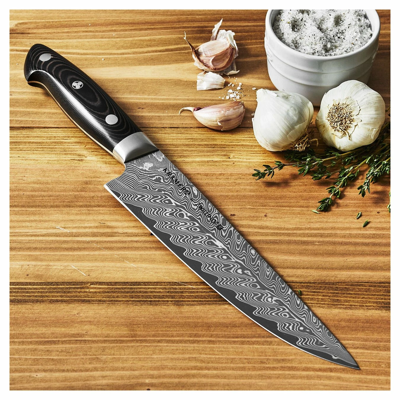 - Riveted black linen Micarta handle with Bob Kramer mosaic pin will not crack or discolor