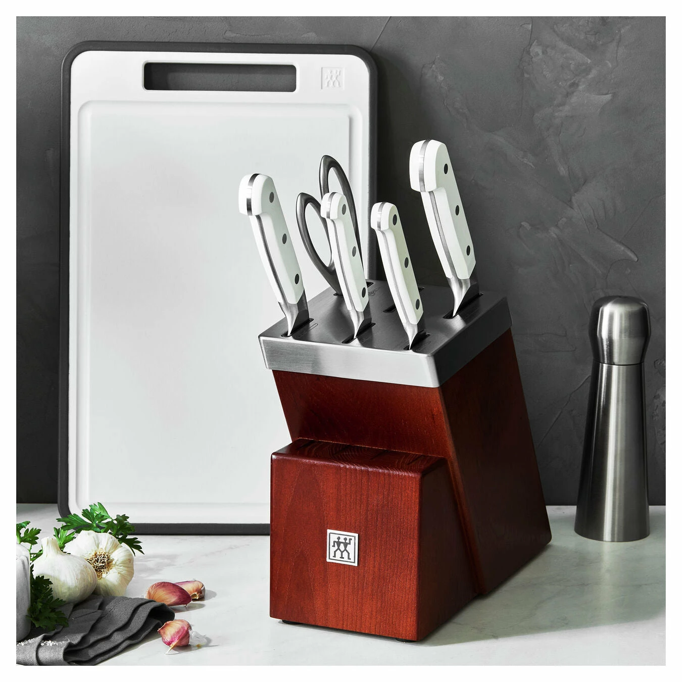 As the modern kitchen specialist, ZWILLING J.A. Henckels makes premium products that enhance the lives of professional and home chefs worldwide. Born from 287 years of cutlery expertise, the ZWILLING Pro Self-Sharpening Knife Block is stocked with all you need to slice, sharpen, and store. Its self-sharpening slots boast built-in ceramic honing wheels that automatically sharpen each time a knife is removed or replaced. This Keep It Sharp (KIS) technology ensures your knives are always on the ready for precision prep work. Fully-loaded with 4 essential knives, shears, and a cutting board, this block sets you up to tackle your everyday kitchen tasks with ease. ZWILLING Pro are the most user-friendly knives on the market. Precision-forged from a single piece of special formula stainless steel, they boast an innovative curved bolster that acts as an extension of the hand—allowing you to comfortably cut with confidence.